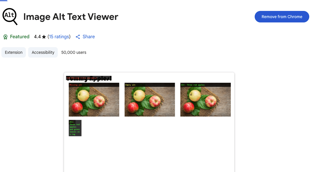 Usually, to see IMG alt text you'd have to right click, click "Inspect", highlight over the image, and read through a jumble of code-looking text.